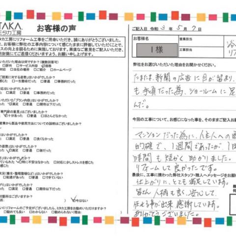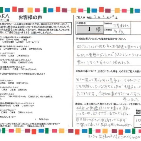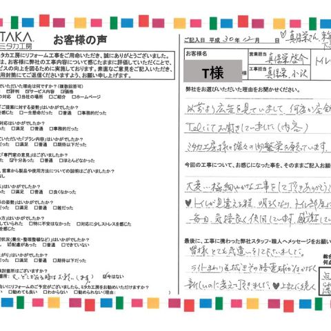 10年前にクロス工事をして頂いて、その時の仕上りが良かったのと、最近、近所の家がリフォームをして、「ミタカさんは良くやってくれるよ」と改めて言われたので。